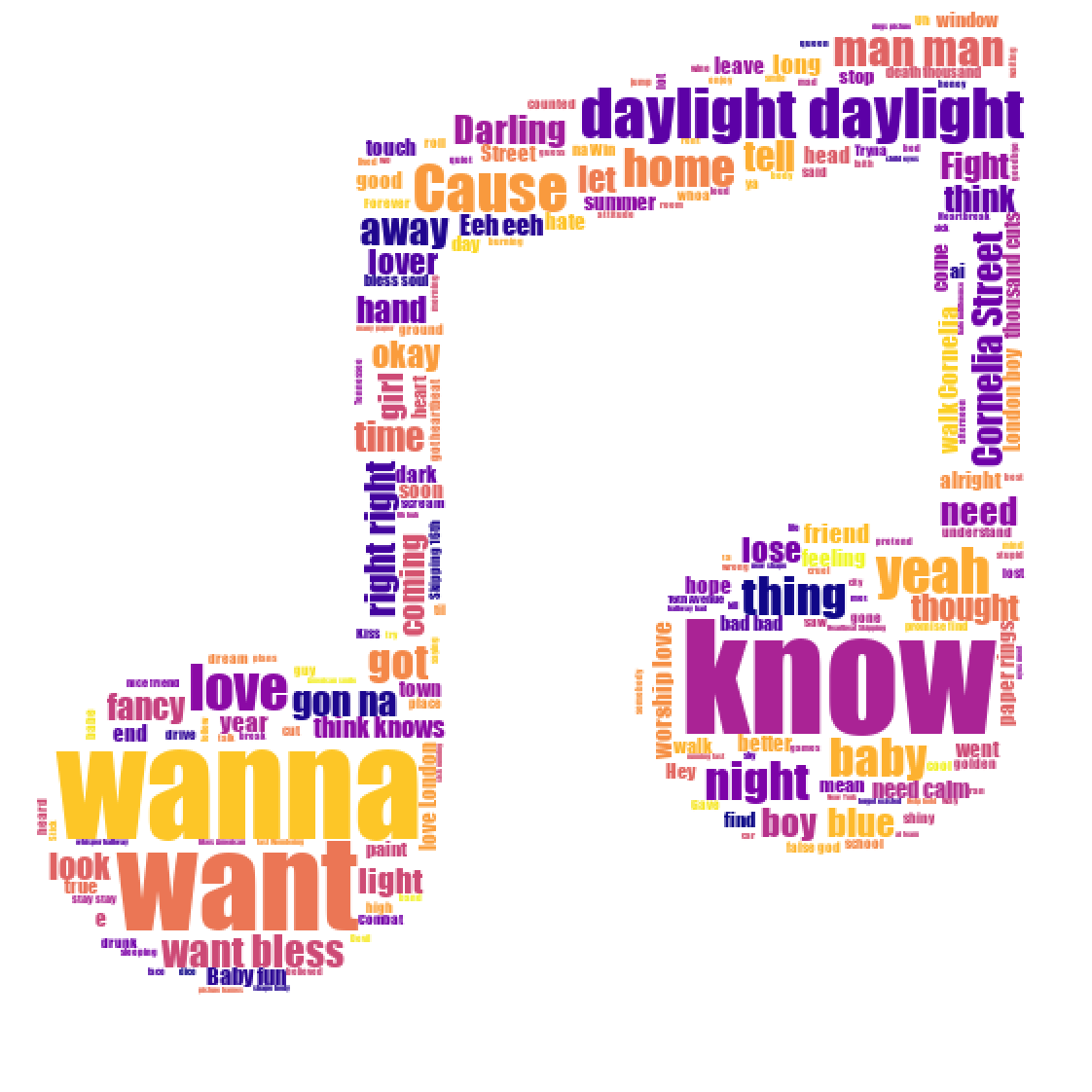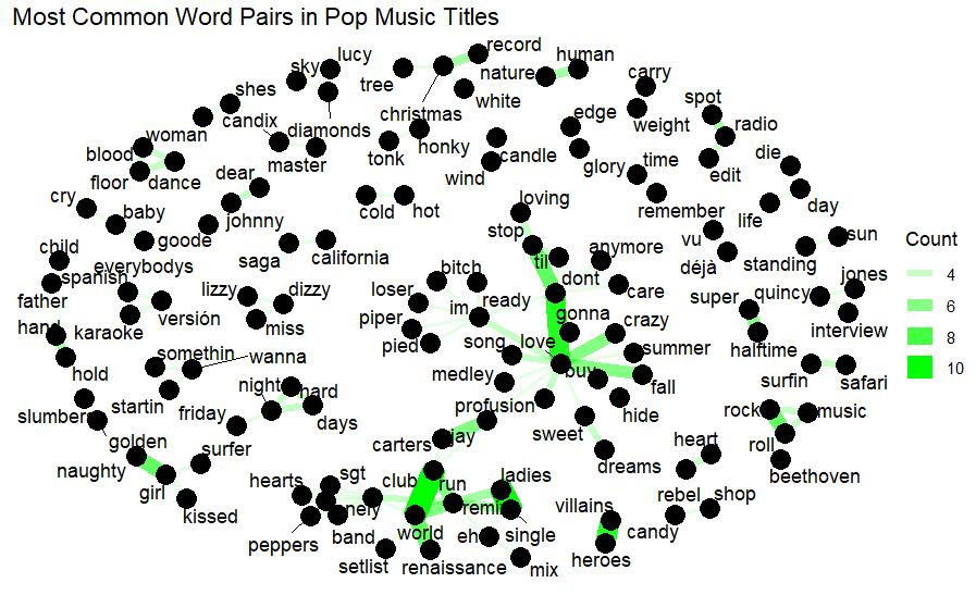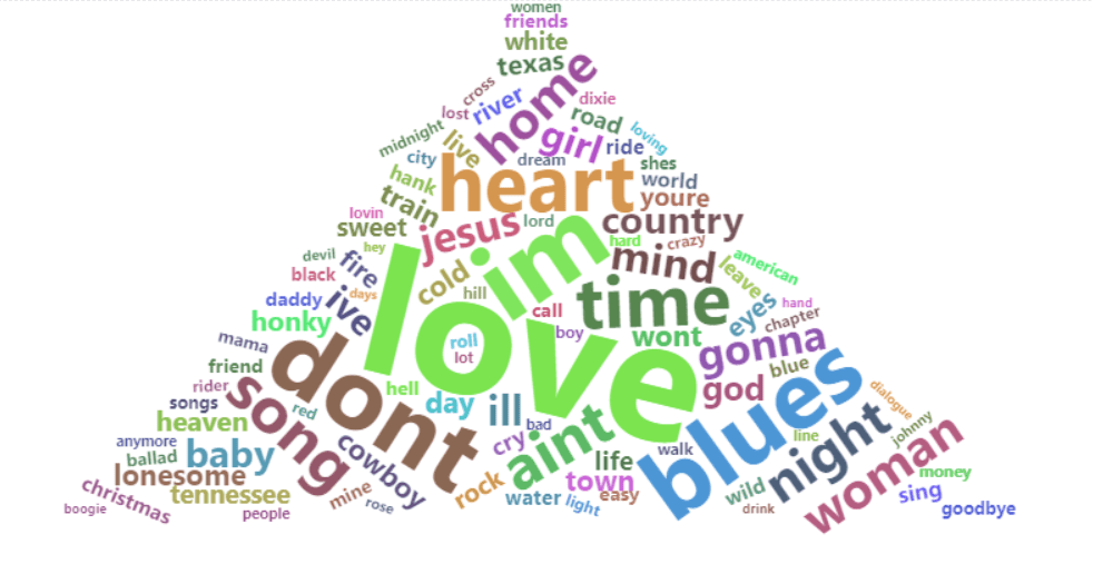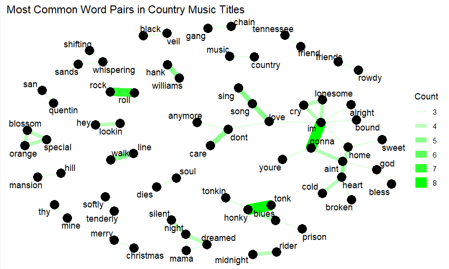 Certain genres of music have words that are more strongly correlated than others. Word pairings can help identify which combinations are more common to a genre. If writing a country song title, some words are much more likely to be associated, such as honky and tonk or tonking. Certain artists are considered staples of the genre and are often referenced by other artists in titles and lyrics. Examples include songs titled “If you don’t like Hank Williams” or “I’m gonna get drunk and play Hank Williams”.