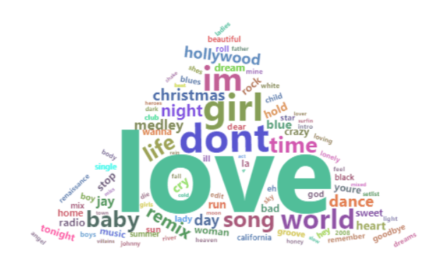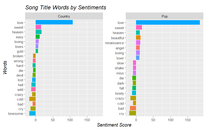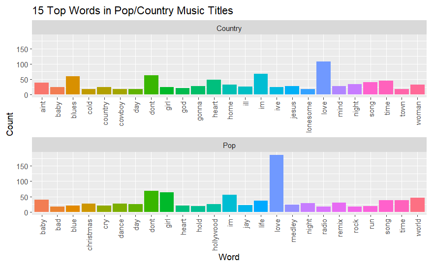 The word love was the most common word in the title in both genres. Certain words are much more common or completely nonexistent. An example would be the word ain’t. Ain’t is heavily used in country music and not at all in pop music. This would be an example of a genre trope that was also analyzed.