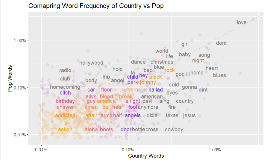 I used text mining to analyze 7000 songs. These songs came from country music and pop music genres. The artists ranged from the 1960s to the present day. The goal was to see what words are common to pop, country, and both. There are clearly many common tropes and words to evoke certain emotions. Artists were selected because their music fell primarily in one genre or the other. Artists like Taylor Swift were avoided for that reason.